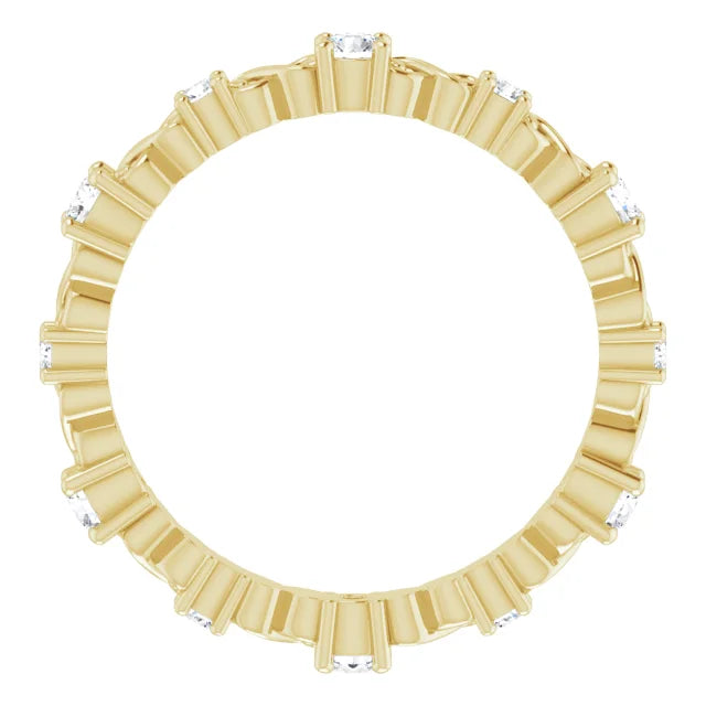 Made in your choice of 18K White, Yellow or Rose Gold this stunning band comes with Round Brilliant Moissanites in Our Trademark DEF Colour and a VS+ Clarity.