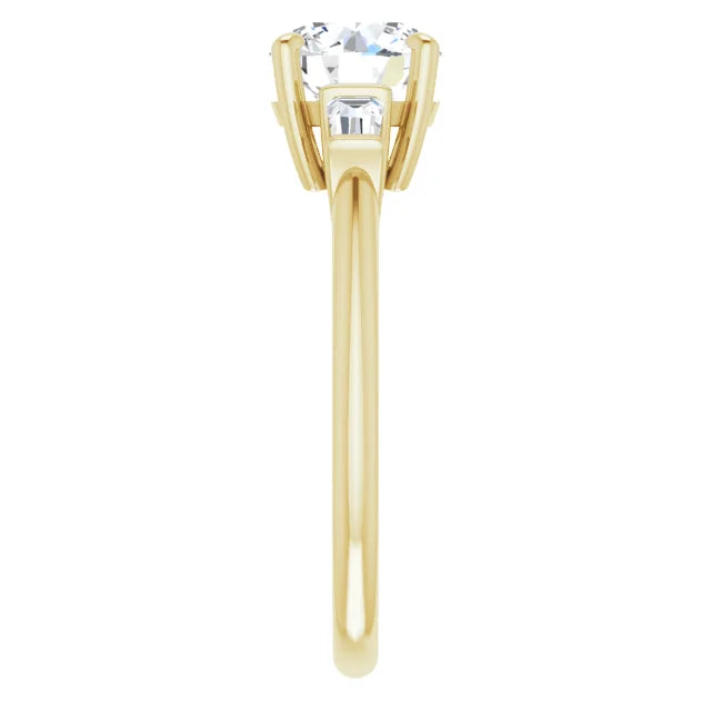 Made in your choice of 18K White, Yellow or Rose Gold this stunning Engagement Ring comes with 2 x Tapered Baguette Moissanites in no less than a DEF Colour and a VS+ Clarity.